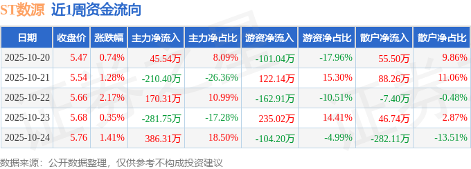 资金流向数据方面,本周ST数源主力资金合计净流入110.01万元,游资资金合计净流出10.98万元,散户资金合计净流出99.03万元。本周资金流向一览见下表: