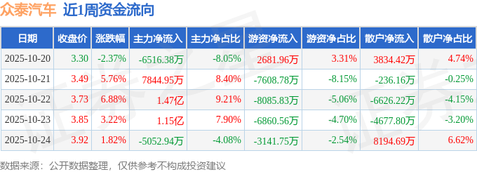 资金流向数据方面,本周众泰汽车主力资金合计净流入2.25亿元,游资资金合计净流出2.3亿元,散户资金合计净流入488.91万元。本周资金流向一览见下表: