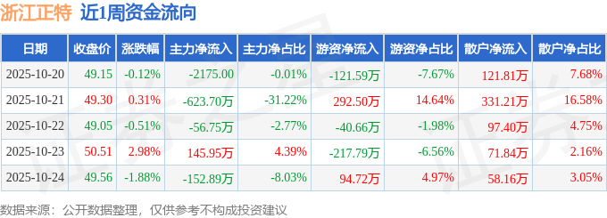 资金流向数据方面,本周浙江正特主力资金合计净流出687.61万元,游资资金合计净流入7.18万元,散户资金合计净流入680.43万元。本周资金流向一览见下表: