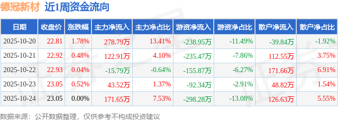 资金流向数据方面,本周德冠新材主力资金合计净流入601.08万元,游资资金合计净流出1020.9万元,散户资金合计净流入419.82万元。本周资金流向一览见下表: