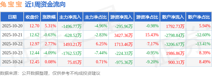 资金流向数据方面,本周兔 宝 宝主力资金合计净流出2319.56万元,游资资金合计净流入3645.17万元,散户资金合计净流出1325.61万元。本周资金流向一览见下表: