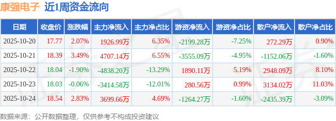 资金流向数据方面,本周康强电子主力资金合计净流入2081.01万元,游资资金合计净流出4847.97万元,散户资金合计净流入2766.96万元。本周资金流向一览见下表: