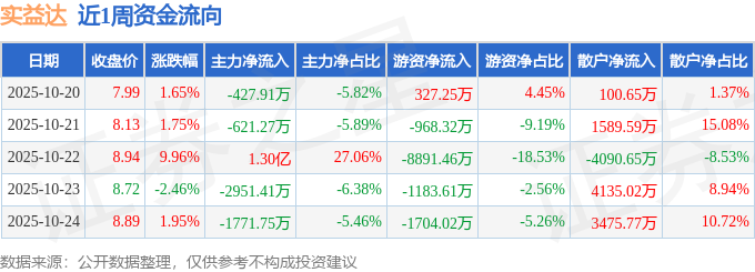 资金流向数据方面,本周实益达主力资金合计净流入7209.78万元,游资资金合计净流出1.24亿元,散户资金合计净流入5210.39万元。本周资金流向一览见下表: