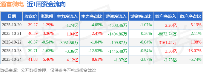 资金流向数据方面,本周通富微电主力资金合计净流出2468.92万元,游资资金合计净流出2.14亿元,散户资金合计净流入2.38亿元。本周资金流向一览见下表: