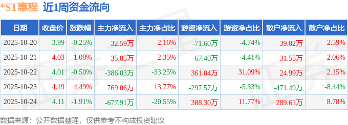 资金流向数据方面,本周*ST惠程主力资金合计净流出226.44万元,游资资金合计净流入312.76万元,散户资金合计净流出86.32万元。本周资金流向一览见下表: