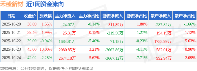 资金流向数据方面,本周禾盛新材主力资金合计净流入3071.46万元,游资资金合计净流出6308.77万元,散户资金合计净流入3237.32万元。本周资金流向一览见下表: