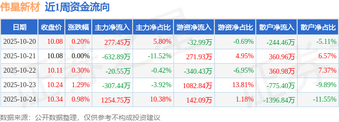 资金流向数据方面,本周伟星新材主力资金合计净流入571.31万元,游资资金合计净流入1123.44万元,散户资金合计净流出1694.75万元。本周资金流向一览见下表: