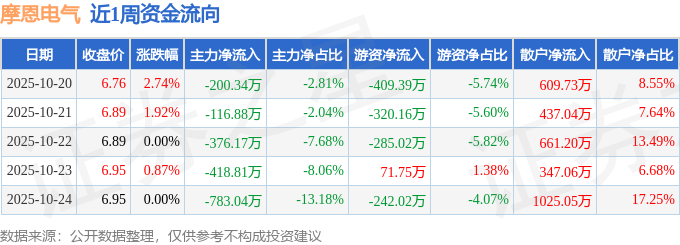 资金流向数据方面,本周摩恩电气主力资金合计净流出1895.24万元,游资资金合计净流出1184.83万元,散户资金合计净流入3080.07万元。本周资金流向一览见下表: