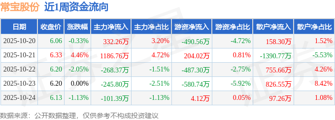 资金流向数据方面,本周常宝股份主力资金合计净流入903.46万元,游资资金合计净流出1350.46万元,散户资金合计净流入447.0万元。本周资金流向一览见下表: