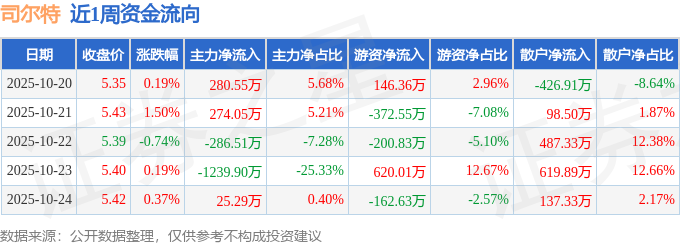 资金流向数据方面,本周司尔特主力资金合计净流出946.51万元,游资资金合计净流入30.37万元,散户资金合计净流入916.15万元。本周资金流向一览见下表: