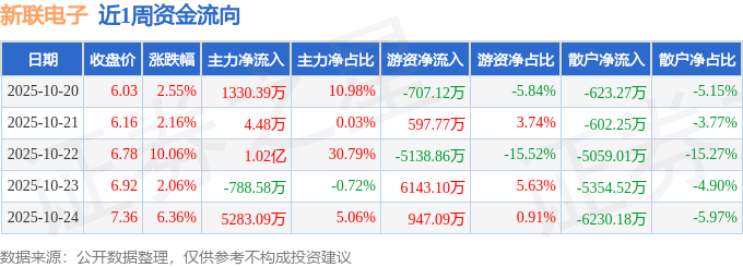 资金流向数据方面,本周新联电子主力资金合计净流入1.6亿元,游资资金合计净流入1841.99万元,散户资金合计净流出1.79亿元。本周资金流向一览见下表: