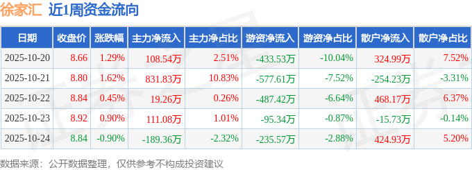 资金流向数据方面,本周徐家汇主力资金合计净流入881.35万元,游资资金合计净流出1829.47万元,散户资金合计净流入948.12万元。本周资金流向一览见下表: