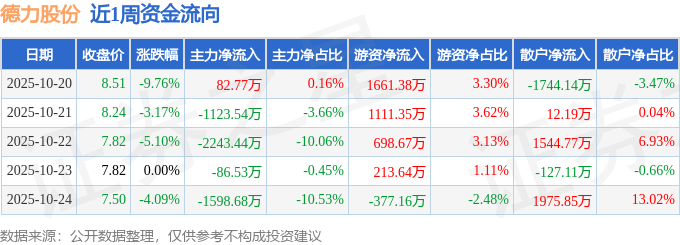 资金流向数据方面,本周德力股份主力资金合计净流出4969.43万元,游资资金合计净流入3307.87万元,散户资金合计净流入1661.56万元。本周资金流向一览见下表:
