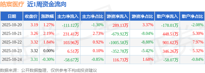 资金流向数据方面,本周皓宸医疗主力资金合计净流入172.1万元,游资资金合计净流出1632.42万元,散户资金合计净流入1460.31万元。本周资金流向一览见下表: