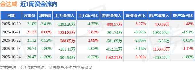资金流向数据方面,本周金达威主力资金合计净流出602.44万元,游资资金合计净流入415.14万元,散户资金合计净流入187.3万元。本周资金流向一览见下表: