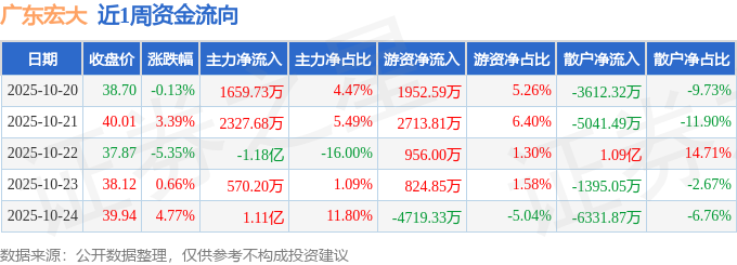 资金流向数据方面,本周广东宏大主力资金合计净流入3801.98万元,游资资金合计净流入1727.91万元,散户资金合计净流出5529.9万元。本周资金流向一览见下表: