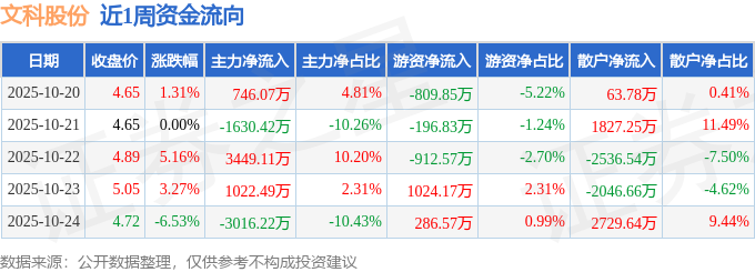 资金流向数据方面,本周文科股份主力资金合计净流入571.03万元,游资资金合计净流出608.5万元,散户资金合计净流入37.47万元。本周资金流向一览见下表:
