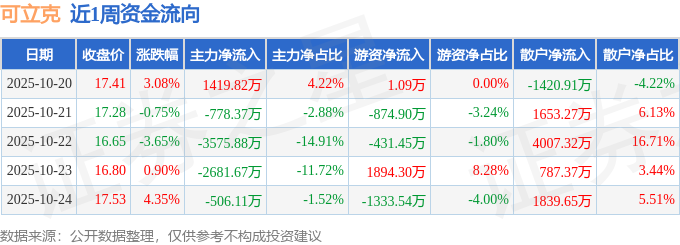资金流向数据方面,本周可立克主力资金合计净流出6122.2万元,游资资金合计净流出744.49万元,散户资金合计净流入6866.69万元。本周资金流向一览见下表: