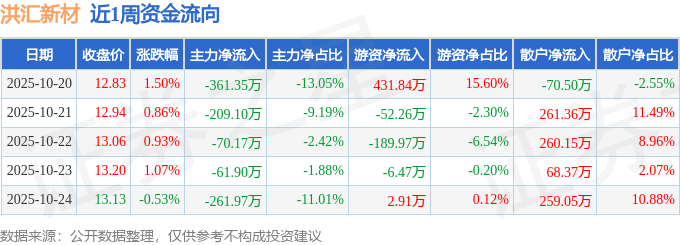 资金流向数据方面,本周洪汇新材主力资金合计净流出964.49万元,游资资金合计净流入186.05万元,散户资金合计净流入778.44万元。本周资金流向一览见下表: