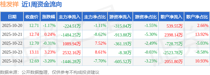 资金流向数据方面,本周桂发祥主力资金合计净流入467.05万元,游资资金合计净流出2204.02万元,散户资金合计净流入1736.97万元。本周资金流向一览见下表: