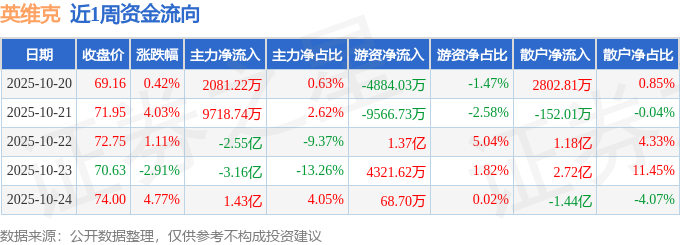 资金流向数据方面,本周英维克主力资金合计净流出3.09亿元,游资资金合计净流入3631.78万元,散户资金合计净流入2.73亿元。本周资金流向一览见下表: