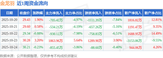 资金流向数据方面,本周金龙羽主力资金合计净流出1161.25万元,游资资金合计净流出1326.18万元,散户资金合计净流入2487.43万元。本周资金流向一览见下表: