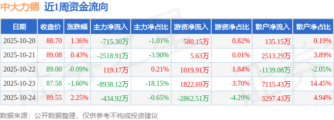 资金流向数据方面,本周中大力德主力资金合计净流出1.25亿元,游资资金合计净流入565.87万元,散户资金合计净流入1.19亿元。本周资金流向一览见下表: