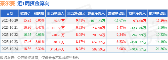 资金流向数据方面,本周豪尔赛主力资金合计净流入6181.17万元,游资资金合计净流入672.9万元,散户资金合计净流出6854.07万元。本周资金流向一览见下表: