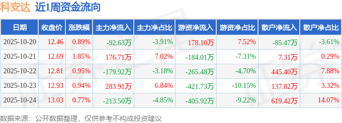 资金流向数据方面,本周科安达主力资金合计净流出25.43万元,游资资金合计净流出1099.05万元,散户资金合计净流入1124.48万元。本周资金流向一览见下表: