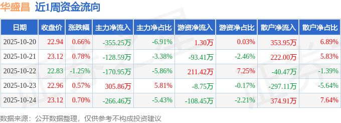 资金流向数据方面,本周华盛昌主力资金合计净流出615.39万元,游资资金合计净流入2.11万元,散户资金合计净流入613.28万元。本周资金流向一览见下表: