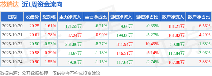 资金流向数据方面,本周芯瑞达主力资金合计净流出479.19万元,游资资金合计净流入132.09万元,散户资金合计净流入347.11万元。本周资金流向一览见下表: