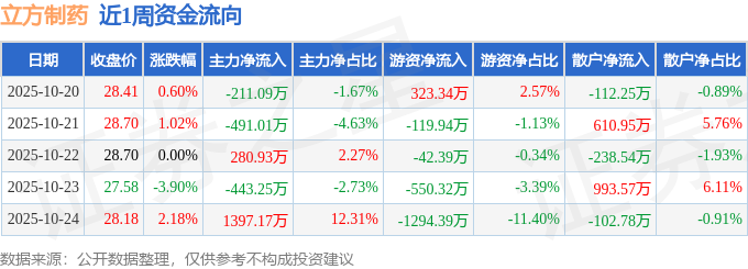 资金流向数据方面,本周立方制药主力资金合计净流入532.75万元,游资资金合计净流出1683.7万元,散户资金合计净流入1150.95万元。本周资金流向一览见下表: