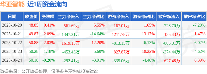资金流向数据方面,本周华亚智能主力资金合计净流入87.8万元,游资资金合计净流入1058.45万元,散户资金合计净流出1146.25万元。本周资金流向一览见下表: