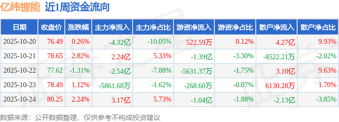 沪深股通持股方面,截止2025年10月24日收盘,亿纬锂能深股通持股数为5270.95万股,占流通股比为283.0%。