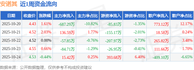 资金流向数据方面,本周安诺其主力资金合计净流出677.84万元,游资资金合计净流出82.25万元,散户资金合计净流入760.09万元。本周资金流向一览见下表: