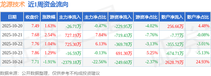 资金流向数据方面,本周龙源技术主力资金合计净流出969.99万元,游资资金合计净流出877.45万元,散户资金合计净流入1847.45万元。本周资金流向一览见下表: