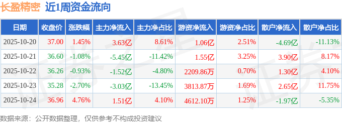 资金流向数据方面,本周长盈精密主力资金合计净流出4.86亿元,游资资金合计净流入3.67亿元,散户资金合计净流入1.18亿元。本周资金流向一览见下表: