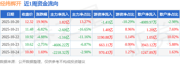 资金流向数据方面,本周经纬辉开主力资金合计净流出2.62亿元,游资资金合计净流入2683.9万元,散户资金合计净流入2.36亿元。本周资金流向一览见下表: