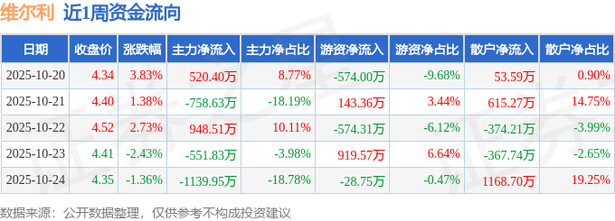资金流向数据方面,本周维尔利主力资金合计净流出981.48万元,游资资金合计净流出114.13万元,散户资金合计净流入1095.61万元。本周资金流向一览见下表: