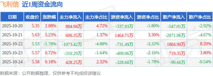 资金流向数据方面,本周飞利信主力资金合计净流入535.84万元,游资资金合计净流出342.37万元,散户资金合计净流出193.47万元。本周资金流向一览见下表: