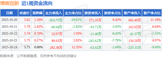 资金流向数据方面,本周博晖创新主力资金合计净流出588.31万元,游资资金合计净流出142.4万元,散户资金合计净流入730.72万元。本周资金流向一览见下表:
