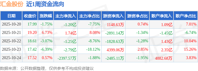 资金流向数据方面,本周汇金股份主力资金合计净流出3.74亿元,游资资金合计净流出1657.19万元,散户资金合计净流入3.91亿元。本周资金流向一览见下表: