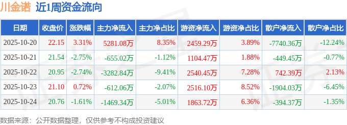 资金流向数据方面,本周川金诺主力资金合计净流出738.19万元,游资资金合计净流入1.05亿元,散户资金合计净流出9745.83万元。本周资金流向一览见下表: