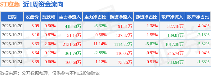 资金流向数据方面,本周ST应急主力资金合计净流入1563.13万元,游资资金合计净流出695.73万元,散户资金合计净流出867.4万元。本周资金流向一览见下表:
