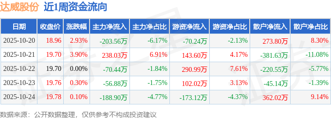资金流向数据方面,本周达威股份主力资金合计净流出281.76万元,游资资金合计净流入293.25万元,散户资金合计净流出11.49万元。本周资金流向一览见下表: