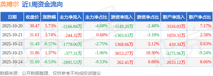 资金流向数据方面,本周英搏尔主力资金合计净流出6974.35万元,游资资金合计净流入2831.51万元,散户资金合计净流入4142.84万元。本周资金流向一览见下表: