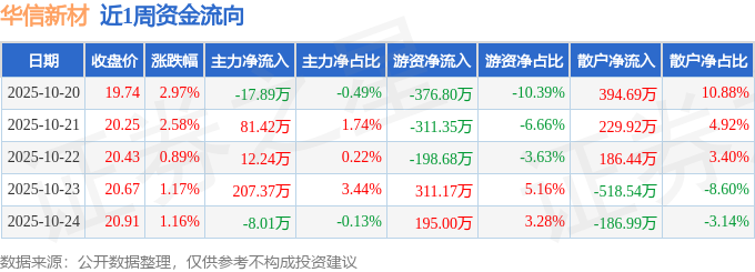 资金流向数据方面,本周华信新材主力资金合计净流入275.14万元,游资资金合计净流出380.65万元,散户资金合计净流入105.51万元。本周资金流向一览见下表:
