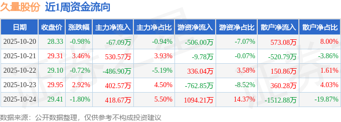 资金流向数据方面,本周久量股份主力资金合计净流入797.83万元,游资资金合计净流入151.62万元,散户资金合计净流出949.45万元。本周资金流向一览见下表: