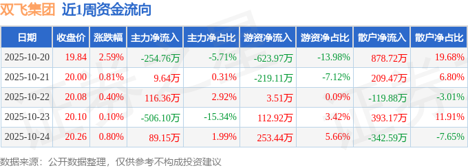 资金流向数据方面,本周双飞集团主力资金合计净流出545.7万元,游资资金合计净流出473.21万元,散户资金合计净流入1018.9万元。本周资金流向一览见下表: