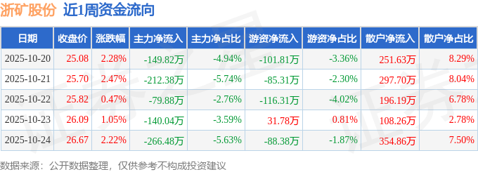 资金流向数据方面,本周浙矿股份主力资金合计净流出848.59万元,游资资金合计净流出360.04万元,散户资金合计净流入1208.63万元。本周资金流向一览见下表: